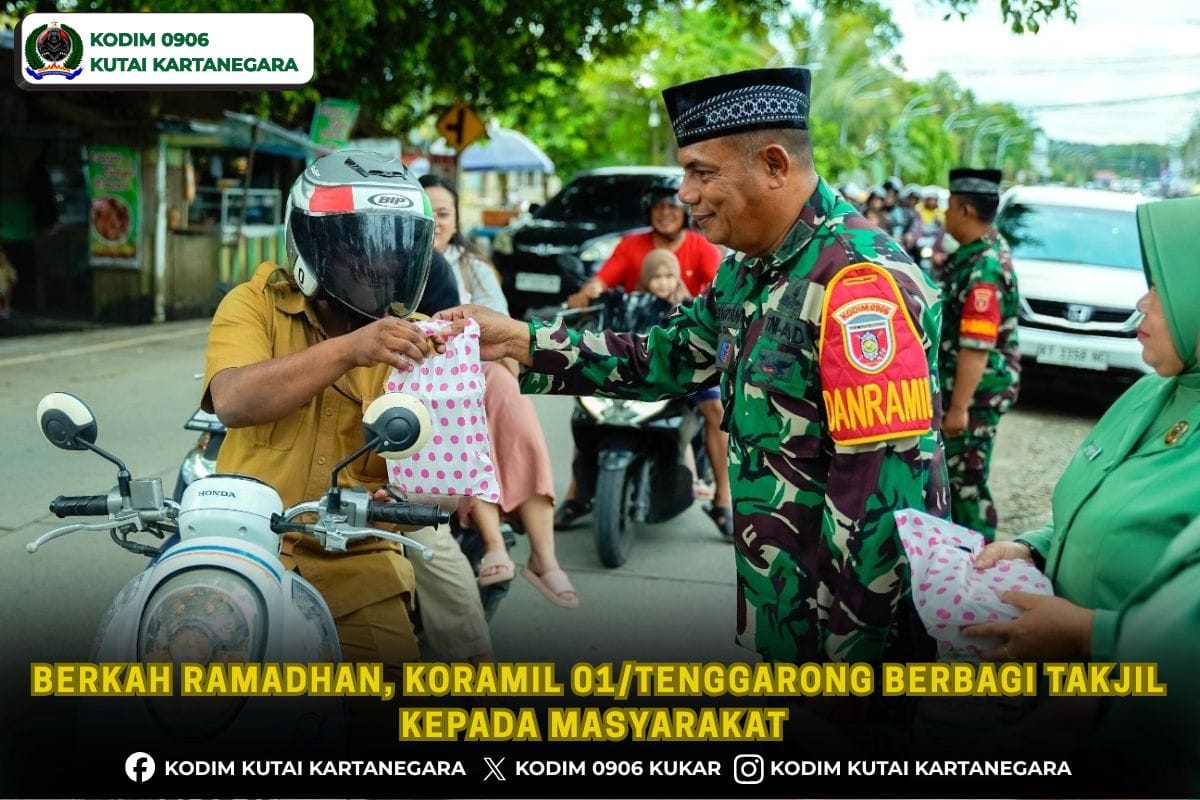 Kutai Kartanegara, cyberpers–  Sebagai wujud kepedulian sosial dan solidaritas sesama umat muslim di bulan suci Ramadhan 1447 H, jajaran Koramil 0906-01/Tenggarong menggelar kegiatan berbagi takjil kepada masyarakat, bertempat di depan Makoramil 0906-01/Tenggarong Jalan Danau Aji Kelurahan Melayu Kecamatan Tenggarong Kabupaten Kutai Kartanegara.