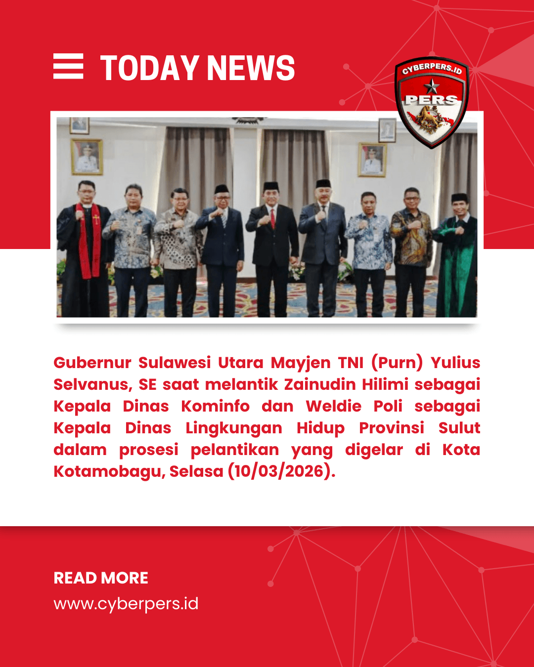 Kotamobagu, cyberpers.id — Gubernur Sulawesi Utara, Mayjen TNI (Purn) Yulius Selvanus, SE, kembali menunjukkan komitmennya dalam mendekatkan pemerintahan kepada masyarakat. Pada Selasa (10/03/2026), di Kota Kotamobagu, Gubernur secara resmi melantik Zainudin Hilimi sebagai Kepala Dinas Komunikasi dan Informatika (Kominfo) serta Weldie Poli sebagai Kepala Dinas Lingkungan Hidup Provinsi Sulawesi Utara.