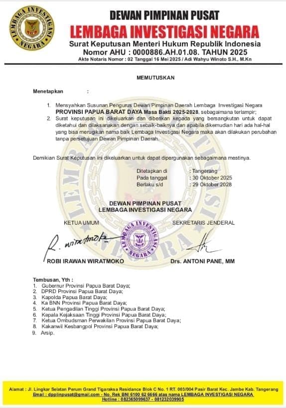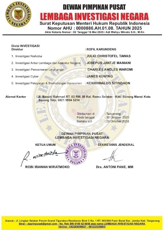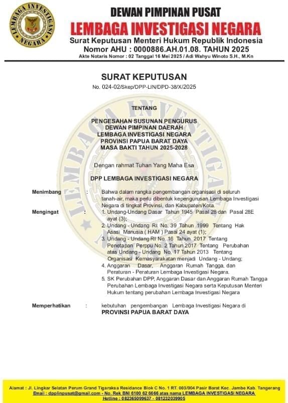 Keputusan itu bukan sekadar formalitas, melainkan hasil evaluasi mendalam terhadap kondisi internal organisasi yang sempat vakum dan tidak produktif. Penetapan Jackson tertuang dalam Surat Keputusan Nomor: 024-02/Skep/DPP-LIN/DPD-38/X/2025 yang ditandatangani langsung oleh Ketua Umum Robbi Irawan dan Sekretaris Jenderal DPP LIN di Tangerang, 30 Oktober 2025, dan berlaku hingga 29 Oktober 2028.