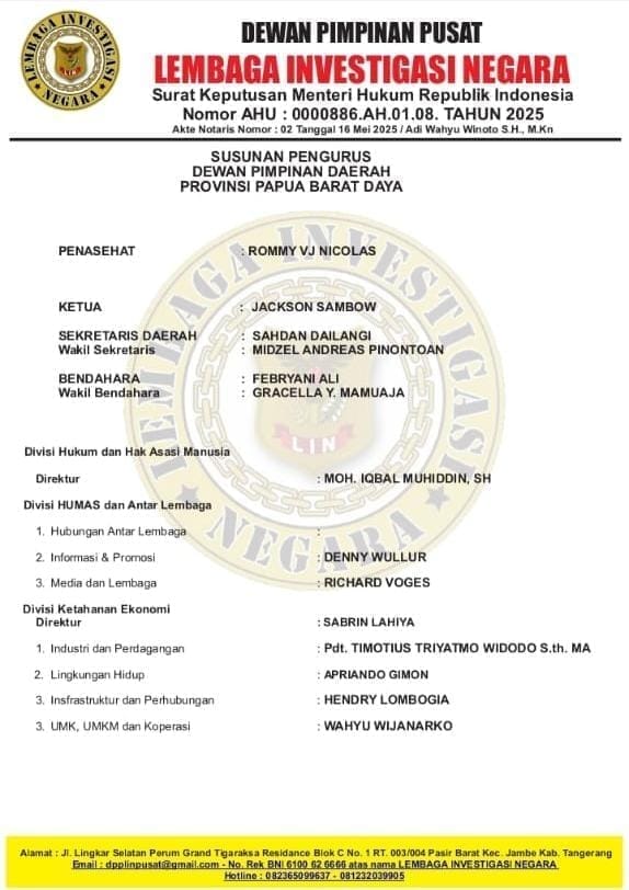 Kini, mata publik tertuju pada Jackson Sambow — sosok yang dikenal lugas dan disiplin — untuk membuktikan bahwa LIN Papua Barat Daya bukan sekadar papan nama, tapi kekuatan nyata dalam menjaga integritas bangsa.