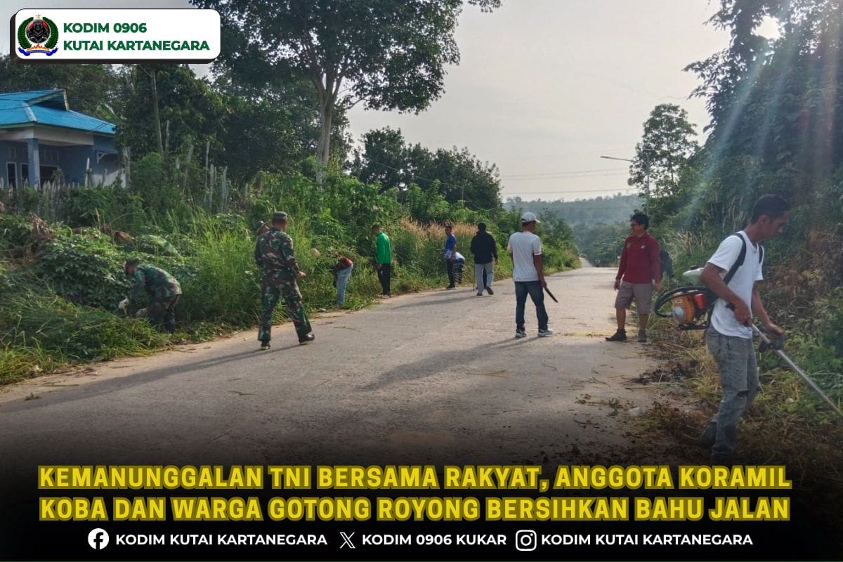 Kutai Kartanegara. cyberpers.id- Sebagai bentuk nyata sinergitas TNI bersama rakyat, anggota Koramil 0906-09/Kota Bangun bersama warga melakukan kegiatan gotong royong pembersihan bahu jalan yang menuju jalan wisata Tanjung serai yang berada di Jalan M Sidik Desa Kota Bangun Ulu Kecamatan Kota Bangun, Sabtu 24/1/26