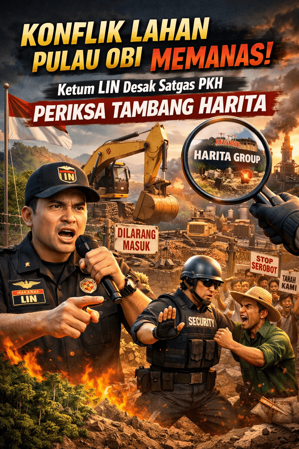 Halmahera Selatan, Maluku Utara — Ketua Umum Dewan Pimpinan Pusat Lembaga Investigasi Negara (DPP LIN), R.I. Wiratmoko, mendesak pemerintah melalui Satuan Tugas Penertiban Kawasan Hutan (Satgas PKH) segera turun tangan menyelesaikan konflik lahan antara warga Desa Soligi dan perusahaan tambang di bawah naungan Harita Group di Pulau Obi, Selasa (10/3/2026).