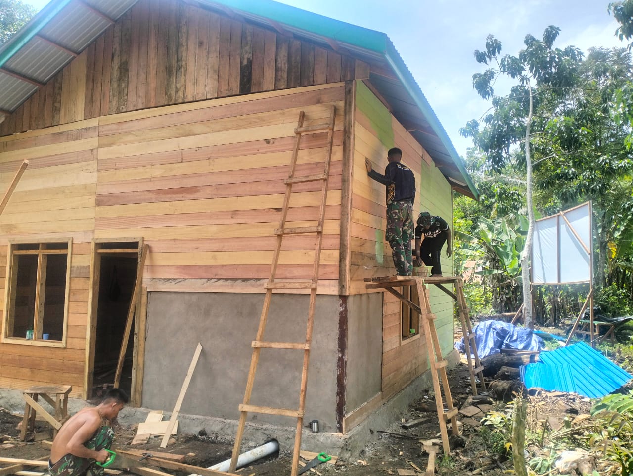 Anggota Satgas kini menggenjot proses pengecatan bagian luar rumah guna memastikan bangunan lebih awet dan tahan terhadap perubahan cuaca.
