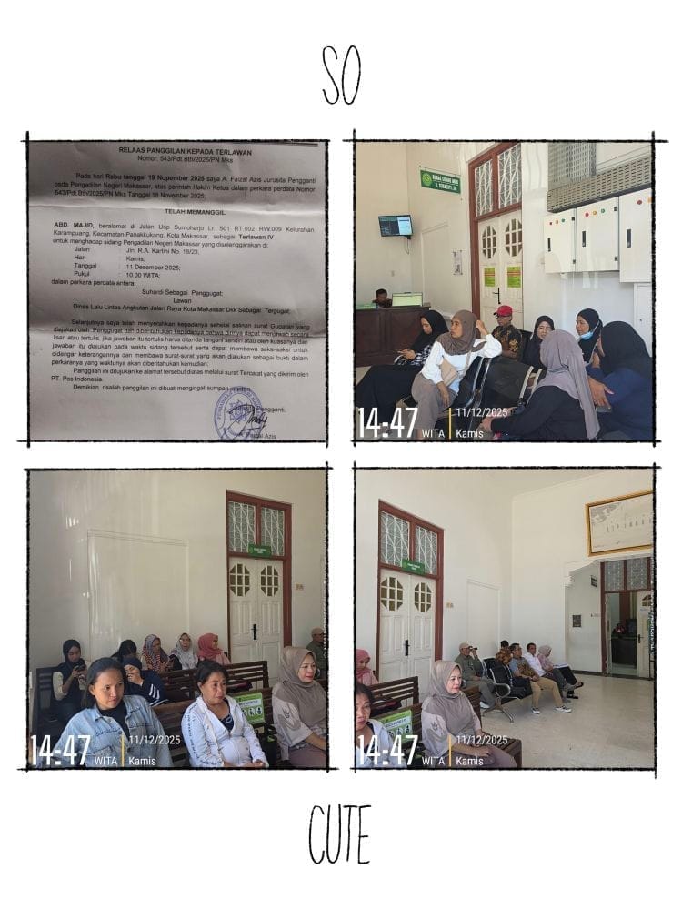 Makassar — Kritik keras kembali menghantam Pengadilan Negeri (PN) Makassar setelah lembaga tersebut kembali menunda sidang dengan alasan yang dinilai tidak masuk akal. Dalam kasus yang melibatkan para ahli waris, sidang yang seharusnya digelar berdasarkan Surat Panggilan Nomor 543/Pdt.Bth/2025/PN Mks tanggal 18 November 2025 justru kembali ditunda meski pihak ahli waris telah hadir tepat waktu.