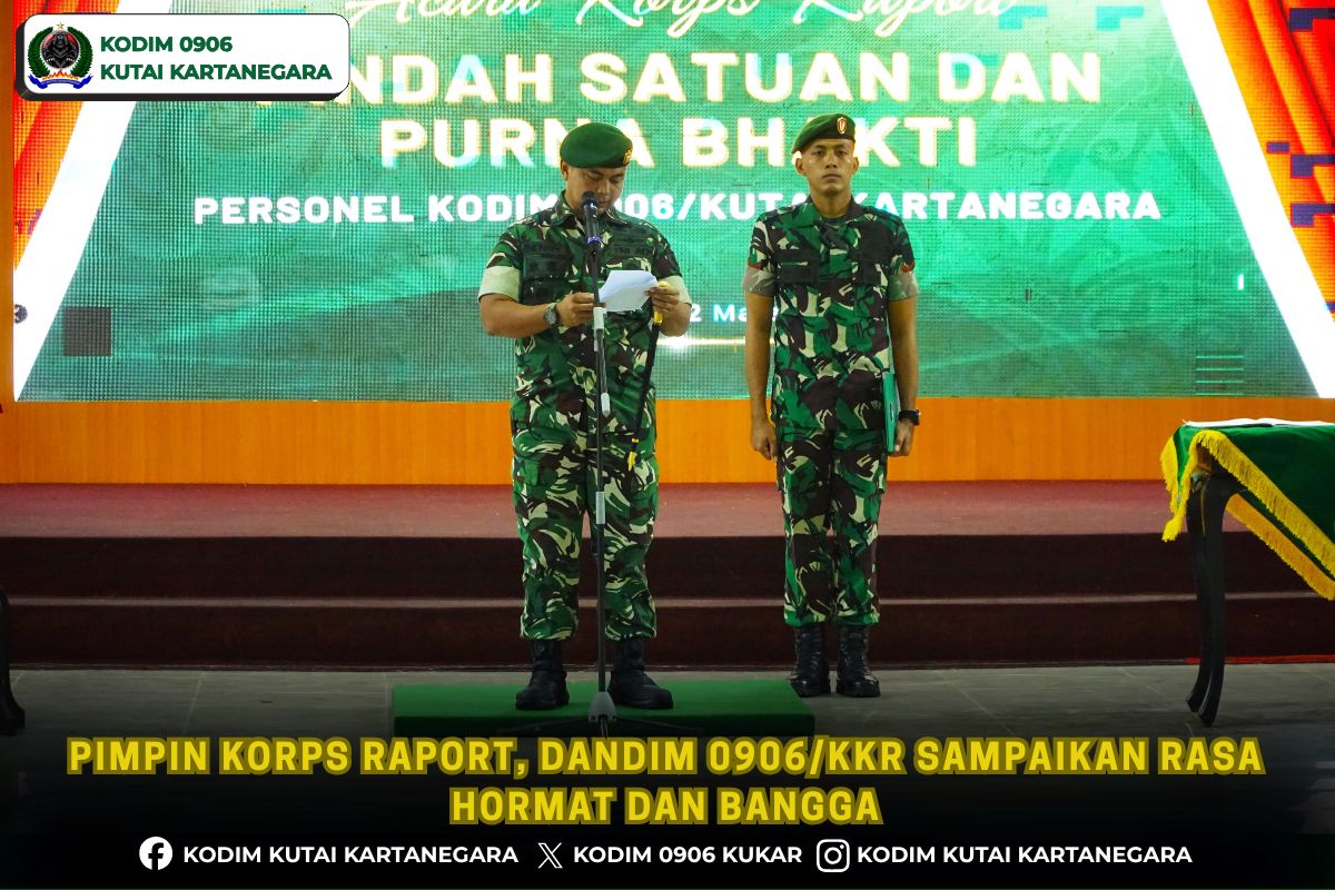 Kutai Kartanegara, cyberpers– Sebagai bentuk penghargaan serta penghormatan kepada prajurit yang telah selesai melaksanakan tugas pengabdian di satuan, Komandan Kodim (Dandim) 0906/Kutai Kartanegara (Kkr), Letkol Arm. Benny Budiman, S.A.P , pimpin acara Korps Raport Pindah Satuan dan Purna Bakti personel Kodim 0906/Kkr yang digelar di aula Darmawangsa Makodim Jalan KH. Ahmad Mukhsin Kelurahan Timbau Kecamatan Tenggarong, Kukar. Senin (02/3/26)