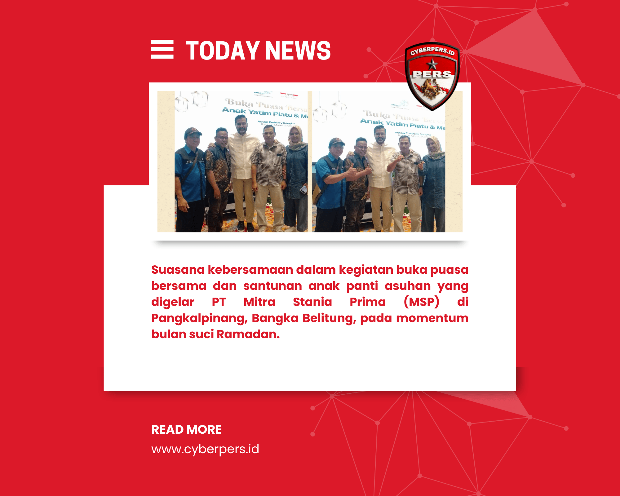 Pangkalpinang, CyberPers.Id – PT Mitra Stania Prima (MSP) menggelar kegiatan buka puasa bersama sekaligus memberikan santunan kepada anak-anak panti asuhan di Pangkalpinang, Bangka Belitung, dalam rangka berbagi kebahagiaan di bulan suci Ramadan. Kamis, (12/3/2026)