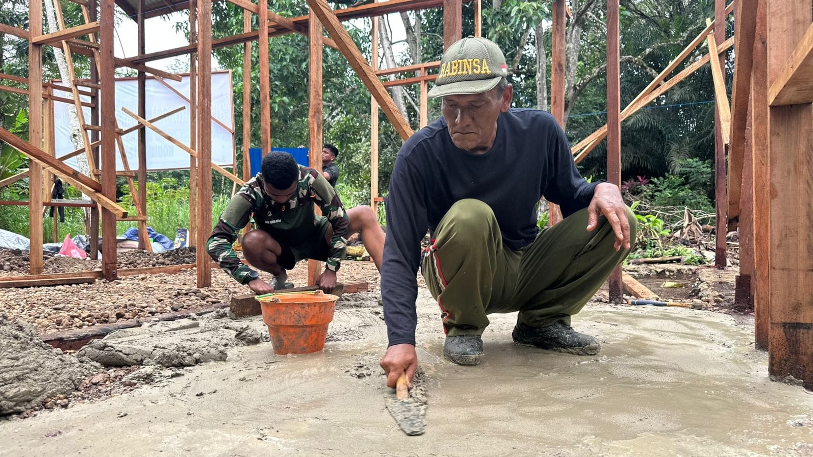 Pada tahap ini, anggota Satgas menyiapkan campuran semen, pasir, dan kerikil sebelum dituangkan dan diratakan ke seluruh permukaan lantai rumah. Pengecoran lantai menjadi tahapan penting untuk memastikan lantai rumah kokoh, rata, dan nyaman saat ditempati nantinya.